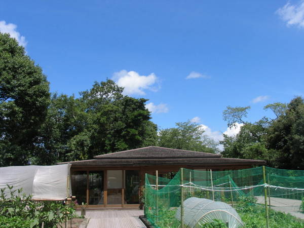 パビリオンの後ろに広がる青空。 手前には、収穫を待っている夏野菜たち 夏です