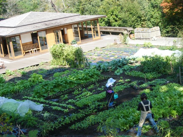 スダジイの木の横からパビリオンと畑を。