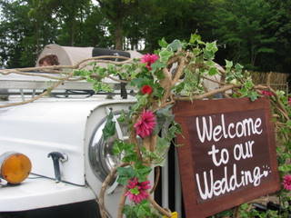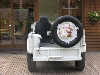 5/16、天空の森で結婚パーティーが行われました。 天空の森のWedding、一部ご紹介です。 ゲストをお迎えするエントランスです。 山葡萄で飾ってみました。 新郎新婦は、 このジープに乗って登場